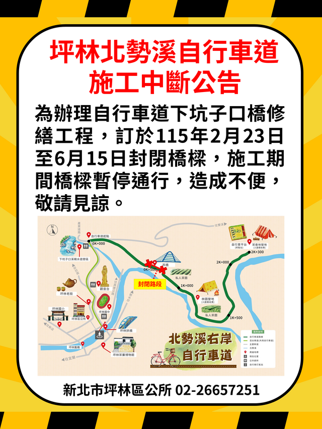 為辦理坪林區吊橋構件損傷修繕工程,北勢溪自行車道下坑子口橋自115年2月23日至6月15日暫停通行。